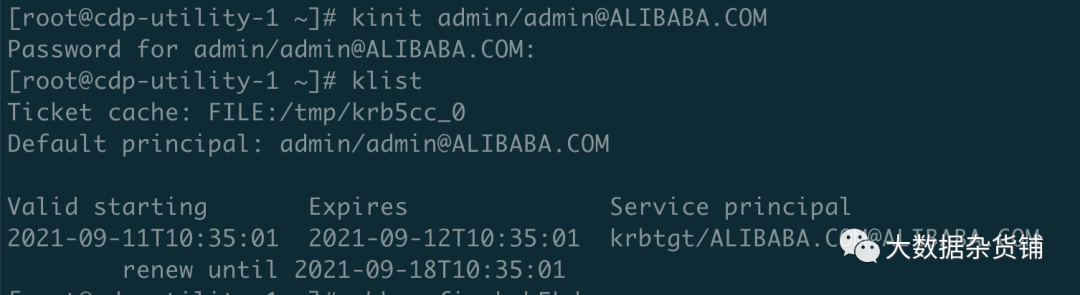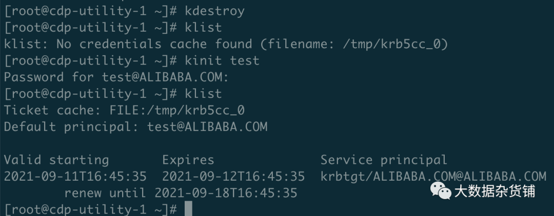 [root@cdp-utility-1 ~]# kdestroy[root@cdp-utility-1 ~]# klistklist: No credentials cache found (filename: /tmp/krb5cc_0)[root@cdp-utility-1 ~]# kinit testPassword for test@ALIBABA.COM:[root@cdp-utility-1 ~]# klistTicket cache: FILE:/tmp/krb5cc_0Default principal: test@ALIBABA.COMValid starting Expires Service principal2021-09-11T16:45:35 2021-09-12T16:45:35 krbtgt/ALIBABA.COM@ALIBABA.COMrenew until 2021-09-18T16:45:35[root@cdp-utility-1 ~]#