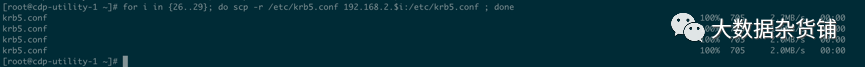 [root@cdp-utility-1 ~]# for i in {26..29}; do scp -r etc/krb5.conf 192.168.2.$i:/etc/krb5.conf ; donekrb5.conf 100% 705 2.2MB/s 00:00krb5.conf 100% 705 1.6MB/s 00:00krb5.conf 100% 705 2.0MB/s 00:00krb5.conf 100% 705 2.0MB/s 00:00[root@cdp-utility-1 ~]#