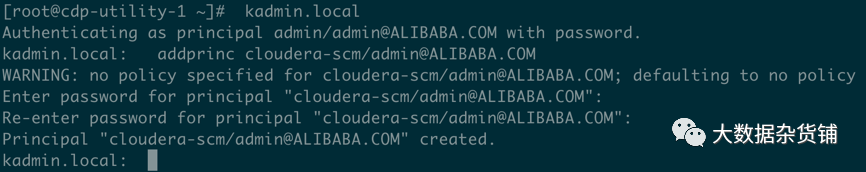 [root@cdp-utility-1 ~]# kadmin.localAuthenticating as principal admin/admin@ALIBABA.COM with password.kadmin.local: addprinc cloudera-scm/admin@ALIBABA.COMWARNING: no policy specified for cloudera-scm/admin@ALIBABA.COM; defaulting to no policyEnter password for principal "cloudera-scm/admin@ALIBABA.COM":Re-enter password for principal "cloudera-scm/admin@ALIBABA.COM":Principal "cloudera-scm/admin@ALIBABA.COM" created.kadmin.local: