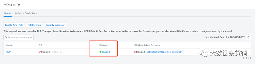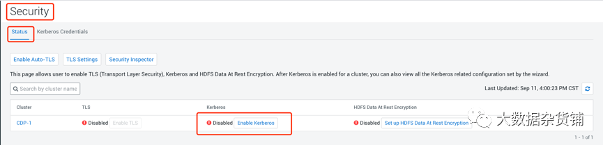 在安全页面进入Status页面,然后点击Enable Kerberos