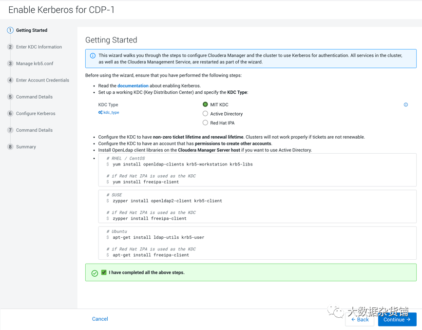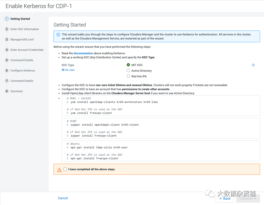选择对应的KDC类型,我们这里使用的是MIT KDC,如果使用其他的KDC类型,请选择对应的类型。然后检查是否对应操作系统的客户端都已经安装完毕,如果没有部署客户端,请按照指示部署完客户端,再复选完成上述所有步骤。