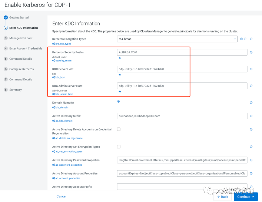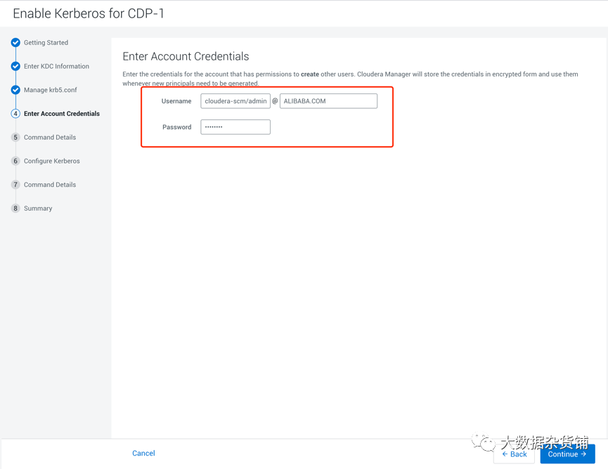 点击继续,进入到输入KDC账户凭证的页面,在页面中输入Cloudera Manager的KDC的管理员账号和密码信息