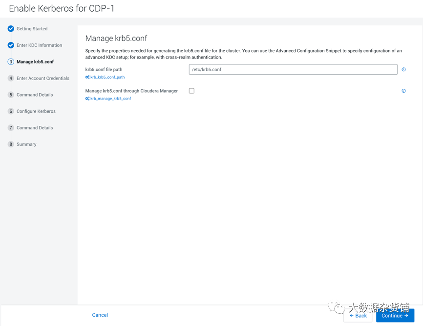 点击继续,进行krb5.conf文件的受管方式和文件路径,推荐不复选,不使用Cloudera Manager来管理krb5.conf文件