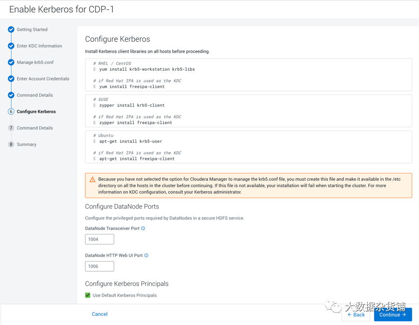 确认配置Kerberos客户端的信息和数据节点的端口号,以及启用Kerberos的Principal。正常保持默认即可,也可以根据自己需求进行调整。然后点击继续