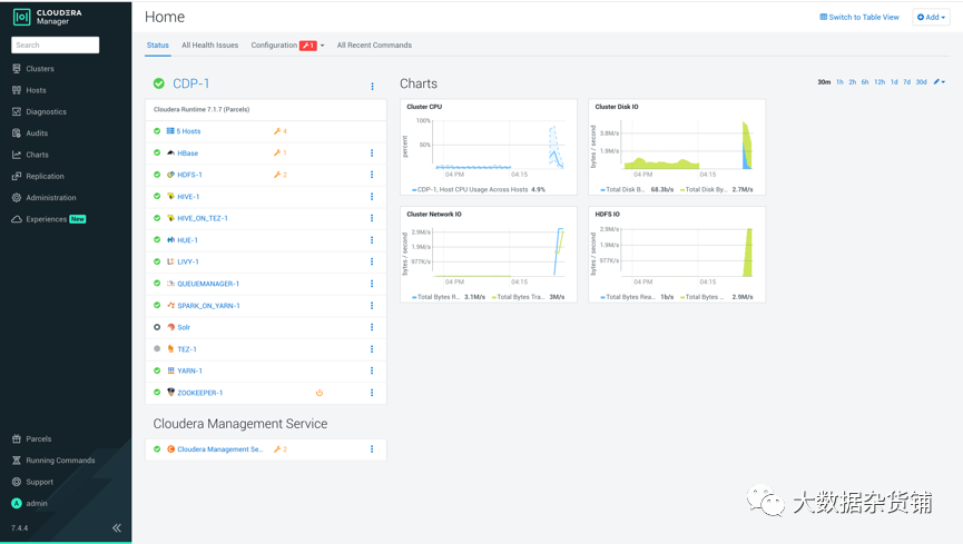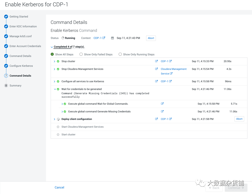 系统会自动停止集群,配置所有服务启用Kerberos,生成凭据,部署客户端,并启用Cloudera Management服务和启动集群。