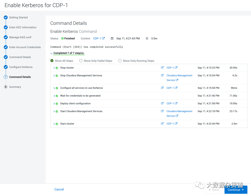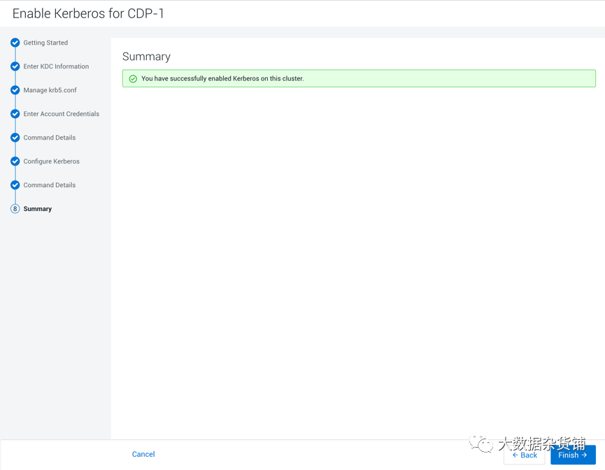 进入到Kerberos启用的执行总结界面,可以看到已经成功为集群启用Kerberos。