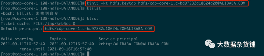 [root@cdp-core-1 108-hdfs-DATANODE]# kinit -kt hdfs.keytab hdfs/cdp-core-1.c-bd97232d18624d20@ALIBABA.COM[root@cdp-core-1 108-hdfs-DATANODE]# klistTicket cache: FILE:/tmp/krb5cc_0Default principal: hdfs/cdp-core-1.c-bd97232d18624d20@ALIBABA.COMValid starting Expires Service principal2021-09-11T16:57:40 2021-09-12T16:57:40 krbtgt/ALIBABA.COM@ALIBABA.COMrenew until 2021-09-16T16:57:40[root@cdp-core-1 108-hdfs-DATANODE]#