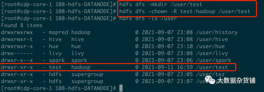 [root@cdp-core-1 108-hdfs-DATANODE]# hdfs dfs -mkdir /user/test[root@cdp-core-1 108-hdfs-DATANODE]# hdfs dfs -chown -R test:hadoop /user/test[root@cdp-core-1 108-hdfs-DATANODE]# hdfs dfs -ls /userFound 8 itemsdrwxrwxrwx - mapred hadoop 0 2021-09-07 23:08 /user/historydrwxrwxr-t - hive hive 0 2021-09-07 23:08 /user/hivedrwxrwxr-x - hue hue 0 2021-09-07 23:10 /user/huedrwx------ - livy livy 0 2021-09-07 23:08 /user/livydrwxr-x--x - spark spark 0 2021-09-07 23:06 /user/sparkdrwxr-xr-x - test hadoop 0 2021-09-11 16:59 /user/testdrwxr-xr-x - hdfs supergroup 0 2021-09-07 23:05 /user/tezdrwxr-xr-x - hdfs supergroup 0 2021-09-07 23:07 /user/yarn[root@cdp-core-1 108-hdfs-DATANODE]#