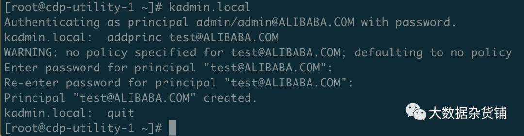 [root@cdp-utility-1 ~]# kadmin.localAuthenticating as principal admin/admin@ALIBABA.COM with password.kadmin.local: addprinc test@ALIBABA.COMWARNING: no policy specified for test@ALIBABA.COM; defaulting to no policyEnter password for principal "test@ALIBABA.COM":Re-enter password for principal "test@ALIBABA.COM":Principal "test@ALIBABA.COM" created.kadmin.local: quit[root@cdp-utility-1 ~]#