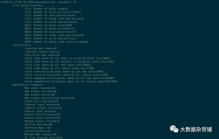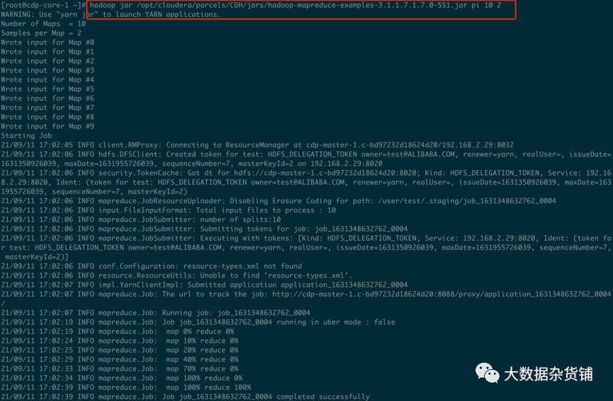 [root@cdp-core-1 ~]# hadoop jar /opt/cloudera/parcels/CDH/jars/hadoop-mapreduce-examples-3.1.1.7.1.7.0-551.jar pi 10 2WARNING: Use "yarn jar" to launch YARN applications.……Shuffle ErrorsBAD_ID=0CONNECTION=0IO_ERROR=0WRONG_LENGTH=0WRONG_MAP=0WRONG_REDUCE=0File Input Format CountersBytes Read=1180File Output Format CountersBytes Written=97Job Finished in 33.783 secondsEstimated value of Pi is 3.80000000000000000000[root@cdp-core-1 ~]#