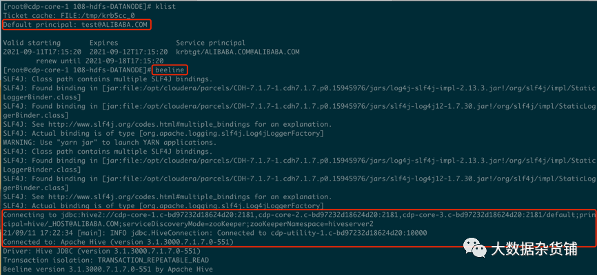 [root@cdp-core-1 108-hdfs-DATANODE]# klistTicket cache: FILE:/tmp/krb5cc_0Default principal: test@ALIBABA.COMValid starting Expires Service principal2021-09-11T17:15:20 2021-09-12T17:15:20 krbtgt/ALIBABA.COM@ALIBABA.COMrenew until 2021-09-18T17:15:20[root@cdp-core-1 108-hdfs-DATANODE]# beelineSLF4J: Class path contains multiple SLF4J bindings.SLF4J: Found binding in [jar:file:/opt/cloudera/parcels/CDH-7.1.7-1.cdh7.1.7.p0.15945976/jars/log4j-slf4j-impl-2.13.3.jar!/org/slf4j/impl/StaticLoggerBinder.class]……Connecting to jdbc:hive2://cdp-core-1.c-bd97232d18624d20:2181,cdp-core-2.c-bd97232d18624d20:2181,cdp-core-3.c-bd97232d18624d20:2181/default;principal=hive/_HOST@ALIBABA.COM;serviceDiscoveryMode=zooKeeper;zooKeeperNamespace=hiveserver221/09/11 17:22:34 [main]: INFO jdbc.HiveConnection: Connected to cdp-utility-1.c-bd97232d18624d20:10000Connected to: Apache Hive (version 3.1.3000.7.1.7.0-551)Driver: Hive JDBC (version 3.1.3000.7.1.7.0-551)Transaction isolation: TRANSACTION_REPEATABLE_READBeeline version 3.1.3000.7.1.7.0-551 by Apache Hive
