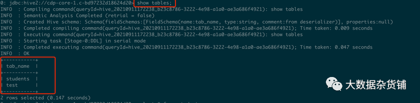 0: jdbc:hive2://cdp-core-1.c-bd97232d18624d20> show tables;……INFO : Completed executing command(queryId=hive_20210911172238_b23c8786-3222-4e98-a1a0-ae3a686f4921); Time taken: 0.047 secondsINFO : OK+-----------+| tab_name |+-----------+| students || test |+-----------+2 rows selected (0.147 seconds)