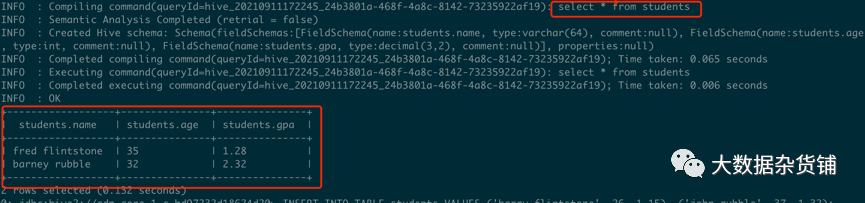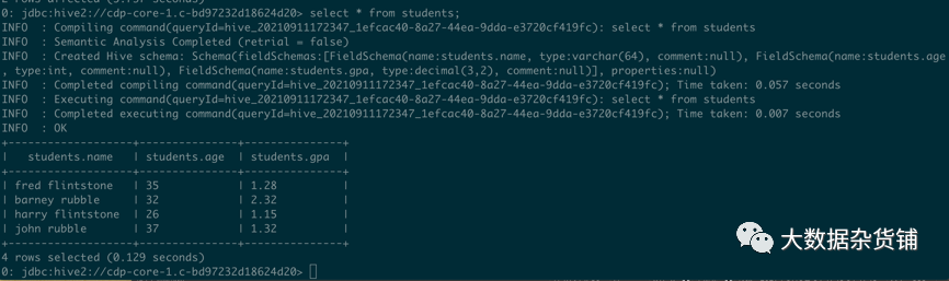 0: jdbc:hive2://cdp-core-1.c-bd97232d18624d20> select * from students;INFO : Compiling command(queryId=hive_20210911172347_1efcac40-8a27-44ea-9dda-e3720cf419fc): select * from students……INFO : Completed executing command(queryId=hive_20210911172347_1efcac40-8a27-44ea-9dda-e3720cf419fc); Time taken: 0.007 secondsINFO : OK+-------------------+---------------+---------------+| students.name | students.age | students.gpa |+-------------------+---------------+---------------+| fred flintstone | 35 | 1.28 || barney rubble | 32 | 2.32 || harry flintstone | 26 | 1.15 || john rubble | 37 | 1.32 |+-------------------+---------------+---------------+4 rows selected (0.129 seconds)0: jdbc:hive2://cdp-core-1.c-bd97232d18624d20>