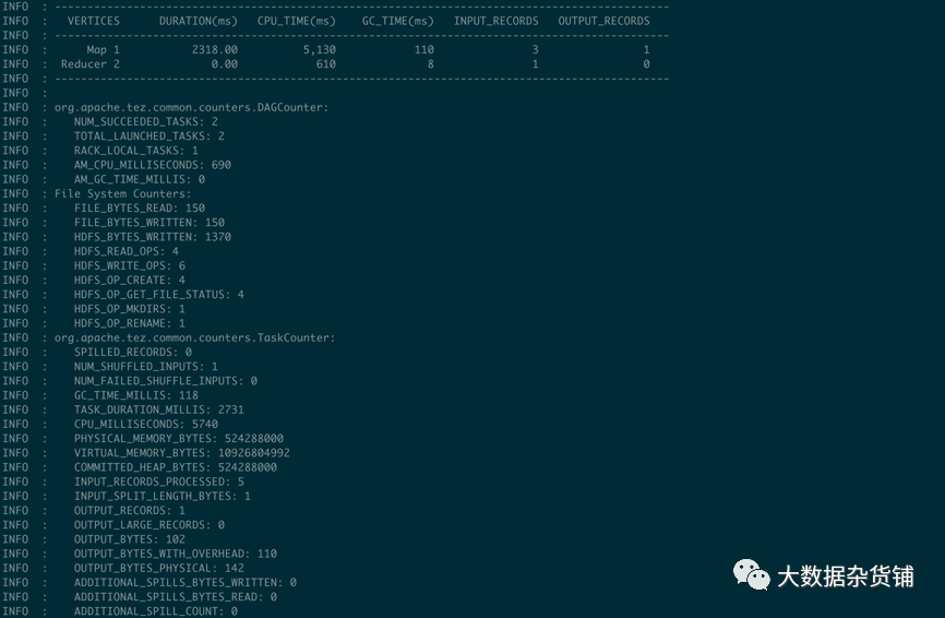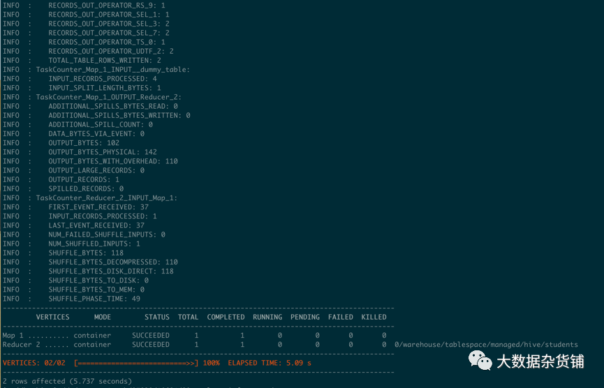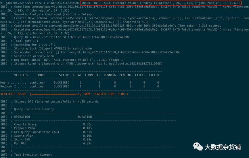 0: jdbc:hive2://cdp-core-1.c-bd97232d18624d20> INSERT INTO TABLE students VALUES ('harry flintstone', 26, 1.15), ('john rubble', 37, 1.32);INFO : Compiling command(queryId=hive_20210911172328_1f699125-6b2c-4c66-80fe-389e8e9a3b0e): INSERT INTO TABLE students VALUES ('harry flintstone', 26, 1.15), ('john rubble', 37, 1.32)……----------------------------------------------------------------------------------------------VERTICES MODE STATUS TOTAL COMPLETED RUNNING PENDING FAILED KILLED----------------------------------------------------------------------------------------------Map 1 .......... container SUCCEEDED 1 1 0 0 0 0Reducer 2 ...... container SUCCEEDED 1 1 0 0 0 0 0/warehouse/tablespace/managed/hive/students----------------------------------------------------------------------------------------------VERTICES: 02/02 [==========================>>] 100% ELAPSED TIME: 5.09 s----------------------------------------------------------------------------------------------2 rows affected (5.737 seconds