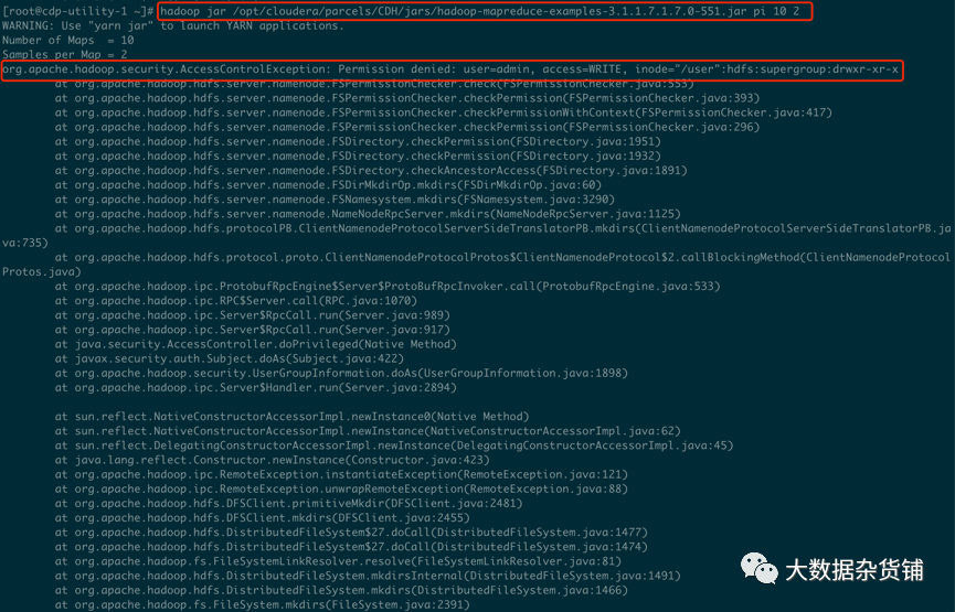 [root@cdp-utility-1 ~]# hadoop jar /opt/cloudera/parcels/CDH/jars/hadoop-mapreduce-examples-3.1.1.7.1.7.0-551.jar pi 10 2WARNING: Use "yarn jar" to launch YARN applications.Number of Maps = 10Samples per Map = 2org.apache.hadoop.security.AccessControlException: Permission denied: user=admin, access=WRITE, inode="/user":hdfs:supergroup:drwxr-xr-xat org.apache.hadoop.hdfs.server.namenode.FSPermissionChecker.check(FSPermissionChecker.java:553)at org.apache.hadoop.hdfs.server.namenode.FSPermissionChecker.checkPermission(FSPermissionChecker.java:393)at org.apache.hadoop.hdfs.server.namenode.FSPermissionChecker.checkPermissionWithContext(FSPermissionChecker.java:417)at org.apache.hadoop.hdfs.server.namenode.FSPermissionChecker.checkPermission(FSPermissionChecker.java:296)at org.apache.hadoop.hdfs.server.namenode.FSDirectory.checkPermission(FSDirectory.java:1951)at org.apache.hadoop.hdfs.server.namenode.FSDirectory.checkPermission(FSDirectory.java:1932)at org.apache.hadoop.hdfs.server.namenode.FSDirectory.checkAncestorAccess(FSDirectory.java:1891)at org.apache.hadoop.hdfs.server.namenode.FSDirMkdirOp.mkdirs(FSDirMkdirOp.java:60)at org.apache.hadoop.hdfs.server.namenode.FSNamesystem.mkdirs(FSNamesystem.java:3290)at org.apache.hadoop.hdfs.server.namenode.NameNodeRpcServer.mkdirs(NameNodeRpcServer.java:1125)at org.apache.hadoop.hdfs.protocolPB.ClientNamenodeProtocolServerSideTranslatorPB.mkdirs(ClientNamenodeProtocolServerSideTranslatorPB.java:735)at org.apache.hadoop.hdfs.protocol.proto.ClientNamenodeProtocolProtos$ClientNamenodeProtocol$2.callBlockingMethod(ClientNamenodeProtocolProtos.java)at org.apache.hadoop.ipc.ProtobufRpcEngine$Server$ProtoBufRpcInvoker.call(ProtobufRpcEngine.java:533)at org.apache.hadoop.ipc.RPC$Server.call(RPC.java:1070)at org.apache.hadoop.ipc.Server$RpcCall.run(Server.java:989)at org.apache.hadoop.ipc.Server$RpcCall.run(Server.java:917)at java.security.AccessController.doPrivileged(Native Method)at javax.security.auth.Subject.doAs(Subject.java:422)at org.apache.hadoop.security.UserGroupInformation.doAs(UserGroupInformation.java:1898)at org.apache.hadoop.ipc.Server$Handler.run(Server.java:2894)at sun.reflect.NativeConstructorAccessorImpl.newInstance0(Native Method)at sun.reflect.NativeConstructorAccessorImpl.newInstance(NativeConstructorAccessorImpl.java:62)at sun.reflect.DelegatingConstructorAccessorImpl.newInstance(DelegatingConstructorAccessorImpl.java:45)at java.lang.reflect.Constructor.newInstance(Constructor.java:423)at org.apache.hadoop.ipc.RemoteException.instantiateException(RemoteException.java:121)at org.apache.hadoop.ipc.RemoteException.unwrapRemoteException(RemoteException.java:88)at org.apache.hadoop.hdfs.DFSClient.primitiveMkdir(DFSClient.java:2481)at org.apache.hadoop.hdfs.DFSClient.mkdirs(DFSClient.java:2455)at org.apache.hadoop.hdfs.DistributedFileSystem$27.doCall(DistributedFileSystem.java:1477)at org.apache.hadoop.hdfs.DistributedFileSystem$27.doCall(DistributedFileSystem.java:1474)at org.apache.hadoop.fs.FileSystemLinkResolver.resolve(FileSystemLinkResolver.java:81)at org.apache.hadoop.hdfs.DistributedFileSystem.mkdirsInternal(DistributedFileSystem.java:1491)at org.apache.hadoop.hdfs.DistributedFileSystem.mkdirs(DistributedFileSystem.java:1466)at org.apache.hadoop.fs.FileSystem.mkdirs(FileSystem.java:2391)at org.apache.hadoop.examples.QuasiMonteCarlo.estimatePi(QuasiMonteCarlo.java:283)at org.apache.hadoop.examples.QuasiMonteCarlo.run(QuasiMonteCarlo.java:360)at org.apache.hadoop.util.ToolRunner.run(ToolRunner.java:76)at org.apache.hadoop.examples.QuasiMonteCarlo.main(QuasiMonteCarlo.java:368)at sun.reflect.NativeMethodAccessorImpl.invoke0(Native Method)at sun.reflect.NativeMethodAccessorImpl.invoke(NativeMethodAccessorImpl.java:62)at sun.reflect.DelegatingMethodAccessorImpl.invoke(DelegatingMethodAccessorImpl.java:43)at java.lang.reflect.Method.invoke(Method.java:498)at org.apache.hadoop.util.ProgramDriver$ProgramDescription.invoke(ProgramDriver.java:71)at org.apache.hadoop.util.ProgramDriver.run(ProgramDriver.java:144)at org.apache.hadoop.examples.ExampleDriver.main(ExampleDriver.java:74)at sun.reflect.NativeMethodAccessorImpl.invoke0(Native Method)at sun.reflect.NativeMethodAccessorImpl.invoke(NativeMethodAccessorImpl.java:62)at sun.reflect.DelegatingMethodAccessorImpl.invoke(DelegatingMethodAccessorImpl.java:43)at java.lang.reflect.Method.invoke(Method.java:498)at org.apache.hadoop.util.RunJar.run(RunJar.java:318)at org.apache.hadoop.util.RunJar.main(RunJar.java:232)Caused by: org.apache.hadoop.ipc.RemoteException(org.apache.hadoop.security.AccessControlException): Permission denied: user=admin, access=WRITE, inode="/user":hdfs:supergroup:drwxr-xr-x