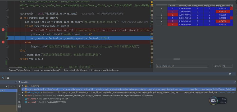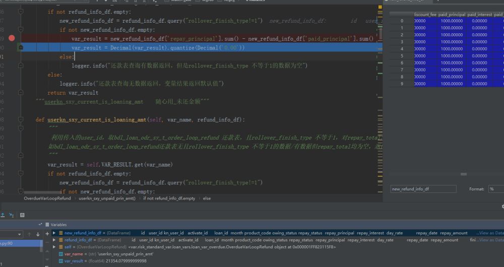 从图中可以看到调试界面最下方输出显示var_result=21354.079999999998,继续查看我们会发现new_refund_info_df这张表中的repay_principal字段数据没有这些小数呀,可能你会猜想是由于后面paid_principal字段的数据含小数,那么我们再看一下paid_principal字段的数据