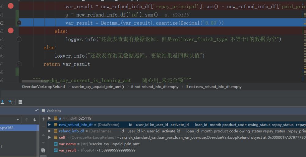 输入数据运行程序时可以返回结果,但是在距离结果的最后一步出现了意外,输出结果明显和实际数据表不一致,导致与开发运行结果不一致,接下来手工复现一下问题场景,来看一下pycharm调试图: