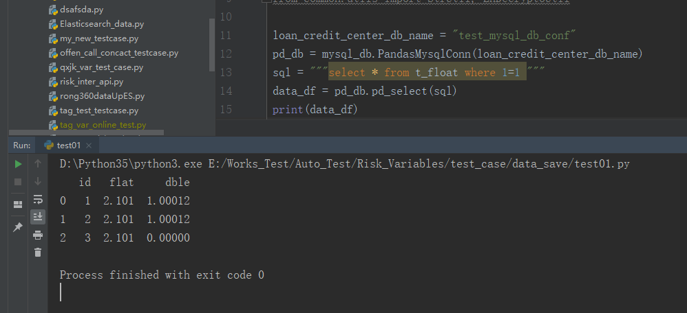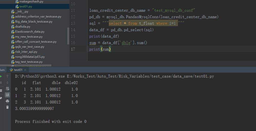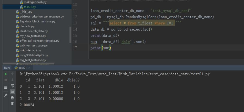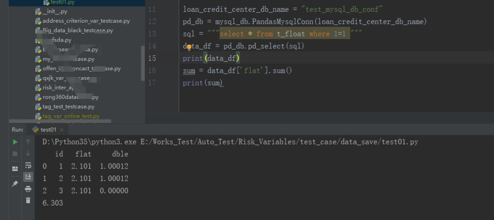 最近主要测试一个字段逻辑项目,基本逻辑就是实现数据表某一字段的数据总和作为结果来输出,由于总体逻辑较为复杂只能通过脚本来实现逻辑的细节,主要使用的是python语言,pandas第三方库来处理逻辑部分,在出现问题的地方使用了pandas的sum()函数求和,同时采用Decimal方法实现数据精度控制。