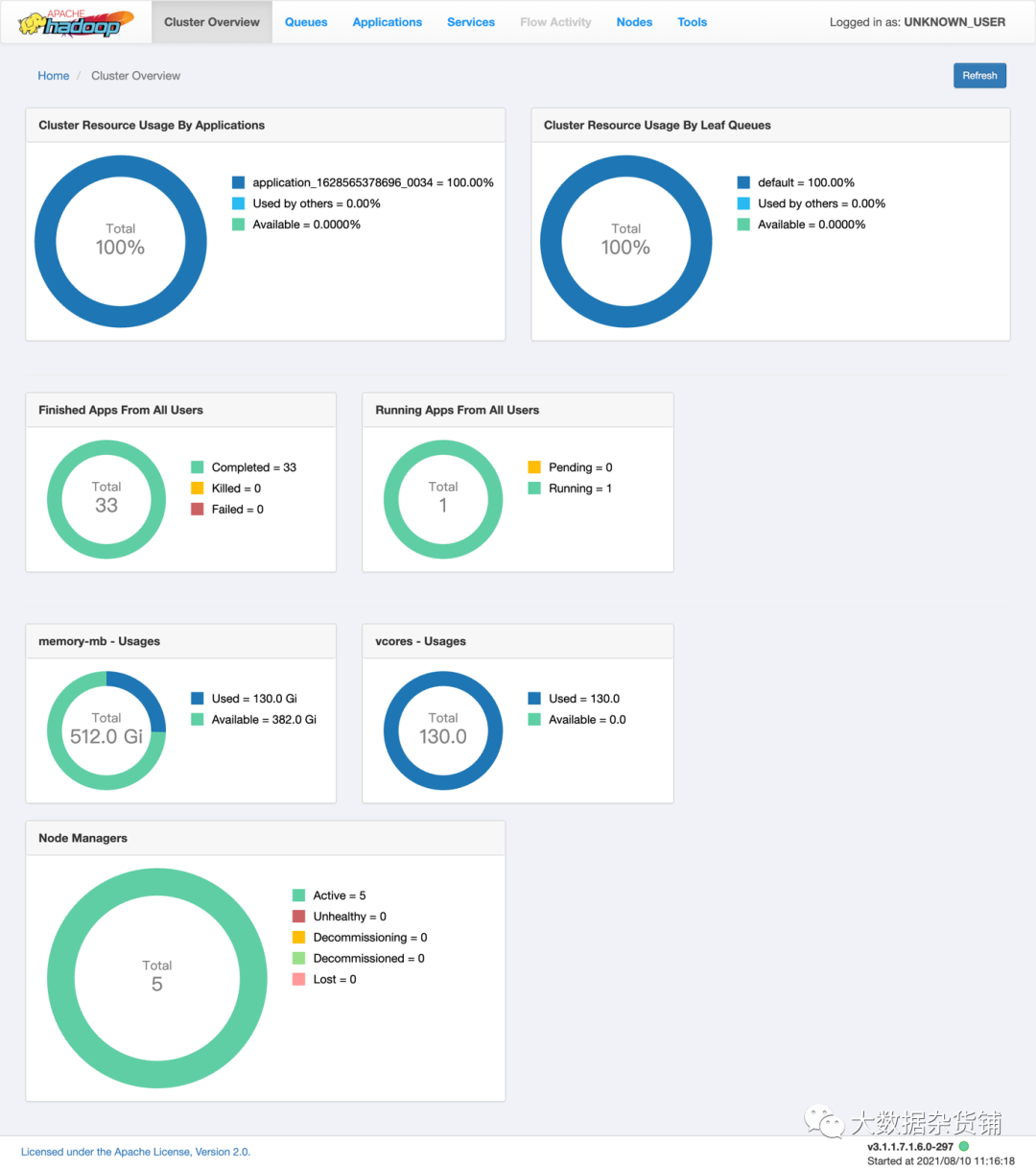 此选项卡以图形表示形式显示节点管理器。它显示详细信息,例如活动节点的数量、不健康的节点的数量、退役的节点和退役的节点管理器的数量。