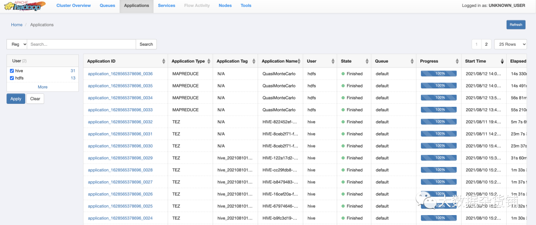 该应用程序页面显示的YARN应用程序以表格形式的列表。您可以在此列表上应用搜索过滤器以仅显示与搜索条件匹配的应用程序。