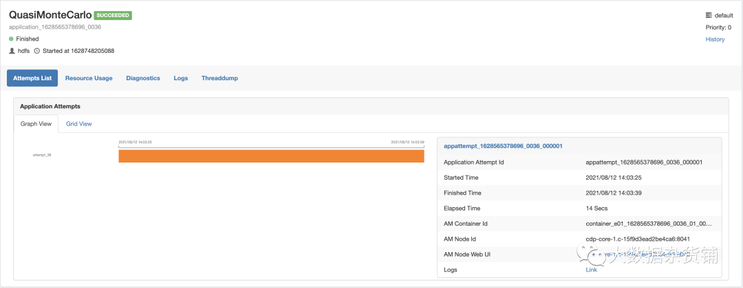 图表显示尝试的开始时间和结束时间。您还可以以表格的形式找到尝试的详细信息,例如应用程序尝试 ID、开始时间、完成时间、已用时间、AM Container ID 和 AM Node ID。您可以使用 AM 节点 Web UI 访问节点 UI。您还可以通过单击日志链接来查看日志。