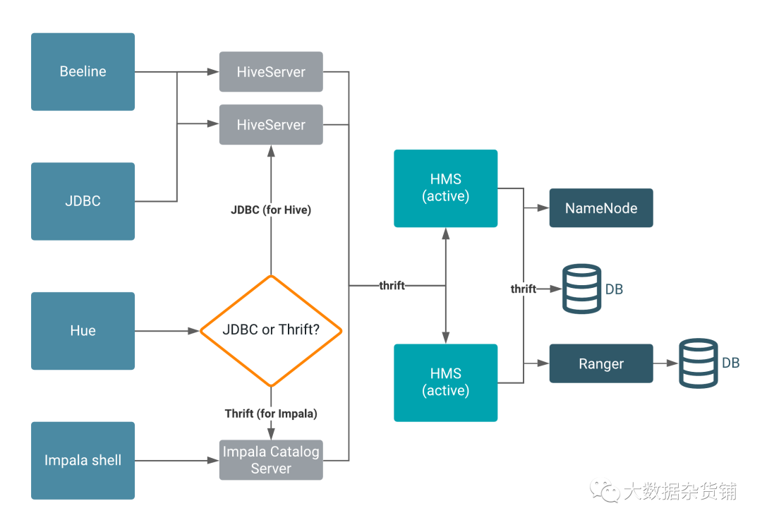 Beeline、Hue、JDBC 和 Impala shell 客户端通过 thrift 或 JDBC 向 HiveServer 发出请求。HiveServer 实例向 HMS 读/写数据。默认情况下,冗余的 HMS 以主动/主动模式运行。物理数据驻留在后端 RDBMS 中,一个用于 HMS的RDBMS。所有的 HMS 实例使用相同的后端数据库。一个单独的 RDBMS 支持安全服务,例如 Ranger。在任何给定时间,所有连接都路由到单一的 RDBMS 服务。HMS 通过thrift与 NameNode 对话,并充当 HDFS 的客户端。