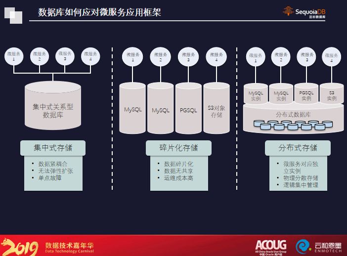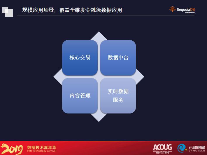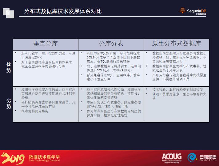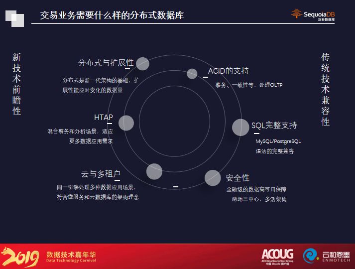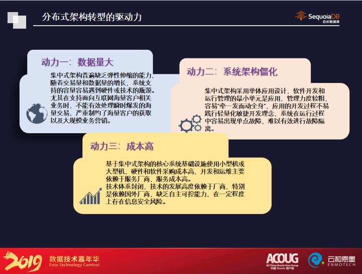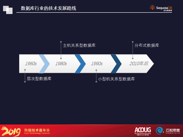 本文是小编依据王涛老师在“2019数据技术嘉年华”大会现场演讲速记稿整理而来。关注公众号“数据和云”,回复:2019dtc ,更多精彩ppt等你下载!(PPT还在不断更新当中,请持续关注)各位尊敬的领导、各位专家,大家早上好!今天非常荣幸能够参与这次“2019数据技术嘉年华”大会,我是巨杉数据库的CTO 王涛,今天我汇报的主题是:“新一代分布式数据库”。分布式数据库也并不是最近几年刚兴起的词语,我自己原来做IBM DB2的,可能很多人不知道DB2是支持分布式事务的关系型数据库。IBM DB2从上世纪90年代开始做分布式数据库,同时也支持分布式事务。先来回顾一下整个数据库的行业是怎样发展的,当前整个数据库的行业分布是什么样的。从数据库的发展史来看,大家都知道关系型数据库并不是最古老的数据库,它从上个世纪70年代发展而来,这之前有IBM类似网状或者层次性的数据库,到了70年代IBM研究员发表了关系型数据库的论文才促成第一款关系型数据库Oracle的诞生。关系型数据库作为一个巨无霸,像Oracle、DB2一统江湖到了现在。就像现在很多新型数据库,包括我们也都开始支持分布式的事务,比如说MongoDB这一类也在开始支持分布式的交易,向很多事务型数据库靠拢。在几十年过程当中,我们发现除了软件本身之外最大的变化是硬件。从最开始的大型主机到90年代的小型机,直到现在大家使用PC服务器做部署,数据库发展和硬件发展息息相关绑在一起。随着金融业务的移动互联网化和智能化,传统数据库已经无法应对数据量大、系统架构僵化及成本过高等诸多问题。与此同时,这些问题的存在也成为推动传统业务向分布式架构转型的驱动力。分布式架构转型的驱动力