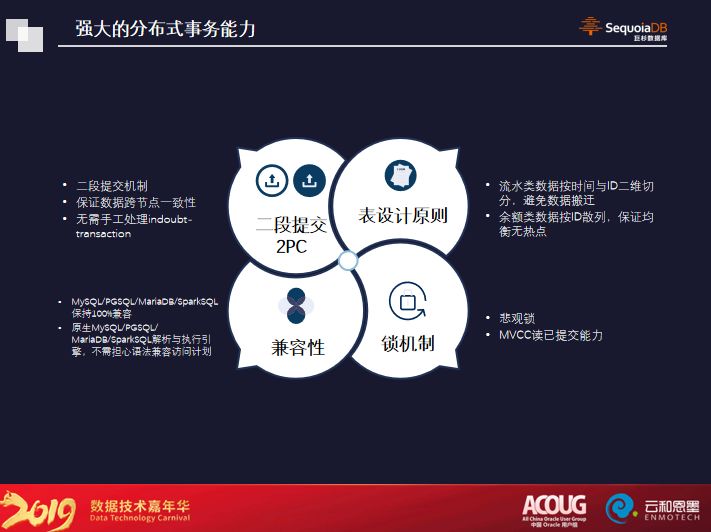 我大概来介绍一下,巨杉数据库的设计过程当中,我们的理念是在什么地方。我们把整个的数据库分成两层,第一层是数据库的实例层,整个集群对外体现的是一个一个的不同的数据库实例,比如有MySQL实例、PG实例,还有非结构化的实例;第二层我们叫做分布式存储层,所有数据存储,所有事务交易都是在存储层来做的。说到分布式交易型数据库,大家肯定关心事务。对于事务来讲我们使用的是二段提交机制,像刚才讲到的,我们过去在IBM DB2从上世纪90年代就涉足分布式的事务。我们在二段提交基础上做很多创新和改良,比如当你做提交时会有时间窗,如果时间窗发生故障需要做手动操作,可以做到自动事务恢复并且保证事务完整性。