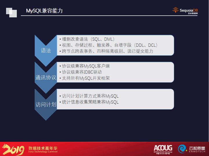 我们跟MySQL的兼容性,对于MySQL来讲,我们是可以保证是在语法层面和MySQL有一个百分之百的兼容。对于用户在MySQL上开发的应用,基本上可以做到不用改,拿过来直接运行。我们现在有很多客户应用直接从MySQL或者PG上迁移过来,我们在数据库集群里创建MySQL兼容实例和PG兼容实例就可以满足这一点。