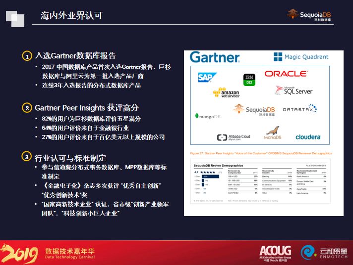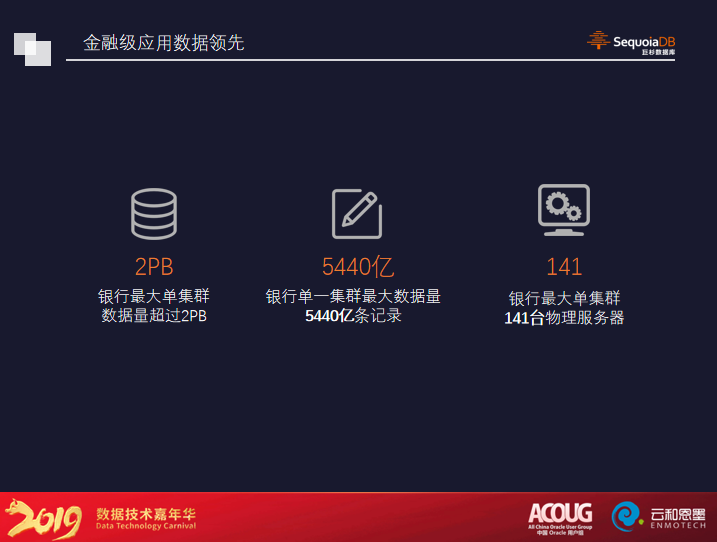 下面,再简单介绍一下我们现在都有哪些场景在使用。首先,我给大家几个数字,银行是我们主要服务的行业,我们现在在银行生产环境最大的单集群超过2PB存储量,单集群超过5440亿条记录存储,整个单一集群141台物理服务器,81个应用连接在上面,我们认为作为新型分布式数据库在一个银行级别的生产环境里能够有这种类型的集群,相对比较少见。我们整个技术方向是来自于IBM DB2作为最核心的底层工程师,同时我们结合了业界分布式云数据库理念来构建一个分布式数据库。我们所服务应用场景,主要是集中在四个场景:核心交易、数据中台、内容管理、实时数据服务。我们在银行里主要应用场景也是围绕这四类的。Gartner是国际比较权威的咨询机构,我们17年Gartner首次把中国数据库纳入他们的评估列表里,17年我们首次和阿里云作为中国数据库纳入到他们的列表里。我们也是连续三年入选Gartner。最后我说一下SequoiaDB 3.4新版本。在这个版本里面,我们在数据库的实例、数据库引擎和大对象引擎的三个领域进行了很大的提升。欢迎大家下载!