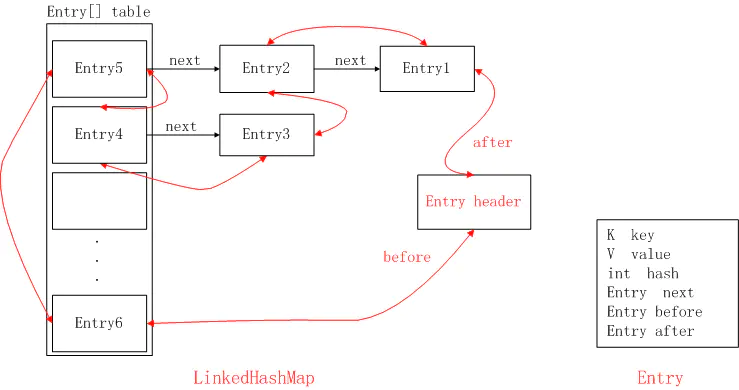 这里的顺序指的是遍历的顺序,定义了头结点head,当我们调用迭代器进行遍历时,通过head开始遍历,通过after属性可以不断找到下一个,直到tail尾结点,从而实现顺序性。在同一个hash(其实更准确的说是同一个下标,数组index ,在上图中表现了同一列)链表内部next和HashMap.Node.next 的效果是一样的。不同点在于before和after可以连接不同hash之间的链表,也就是说双向链表是可以跨任何index 连接的,也就是说将LinkedHashMap里面的所有元素按照特定的顺序连接起来的