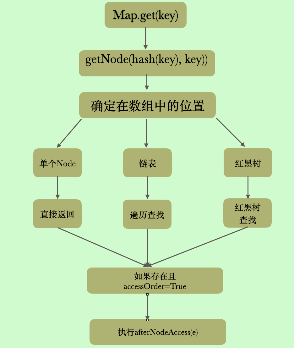首先 LinkedHashMap 重写了get 方法,getNode 方法依然使用的实HashMap 的,当元素存在的时候,判断是否要根据accessOrder 将元素移动到双向链表的尾部