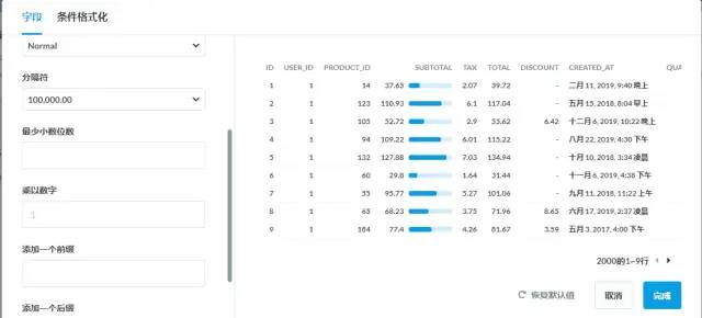 对一些图表可做细节控制,比如表单按条件控制行颜色,调整字段位置,显示迷你彩条,前后缀设定