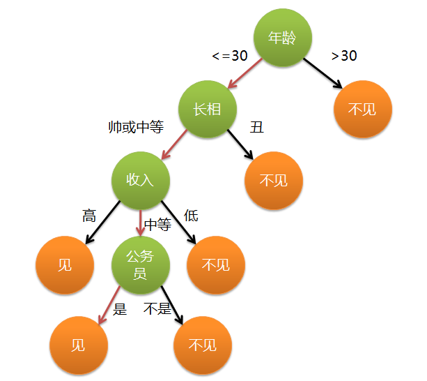 决策树的分析数据包括我们需要决策的目标变量与根据问题所选择的可以对目标变量进行决策的分支变量,我们希望分支变量容易理解与解释决策树。有的属性取值只有二元,比如性别只能取值男女,一道题目的对错。还可以是多个属性值,比如一些学生的年级。还有些属性具有顺序,比如青年、中年、老年,我们不能将他们随意组合。还有一种属性取值是连续的,我们可以将其表示为比如(X>a)或(X<=a)的形式,将其离散化。比如我们可以把年龄分成【0,18】,【19,28】,【29,38】等,而不是把每一岁作为一个属性值,就显得非常臃肿与不必要了。训练集与测试集:拿到一份数据,我们需要将其分为训练集合与测试集,比例一般7:3开都可以。训练集用来训练模型,这里就是构建决策树;测试集用来做测试,根据训练的模型来作预测,进而评价模型的好坏。如果发现模型不很好,就需要适当修剪决策树。决策树的分支准则可以决定树的大小,包括树的宽度与深度。这里介绍几种常用的分支准则:信息增益、信息增益比、Gini系数。在决策树的分支过程中,分支属性可以重复出现,也就是说一个属性可以在不同层使用。任意一条数据有多个不同的属性,当然还有一个目标变量,我们需要根据这些属性提取分类规则,来对目标变量进行分类。这里只拿其中一个属性说明,实际中有几个属性就需要做相同工作几次。对于任意属性A,它可能有多个属性值比如颜色这个属性,就有比如红色、蓝色等属性值。我们可以抽象的描述任一属性与目标变量类别关系表如下: