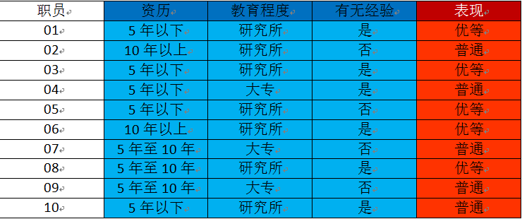 假设有如下数据,我们分别就其计算相应信息增益、信息增益比、Gini系数,展示决策树构建过程的详细计算过程。这里有10条数据,目标分类变量是表现,我们根据几种分支准则做相应手动计算说明。