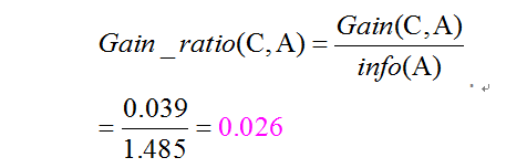 Gain_ratio(教育程度,C) = 0.396/0.881 = 0.449Gain_ratio(经验,C) = 0.125/0.971 = 0.129由教育程度的信息增益比(0.449)最大可知,以教育程度作为分支属性能得到较多信息。