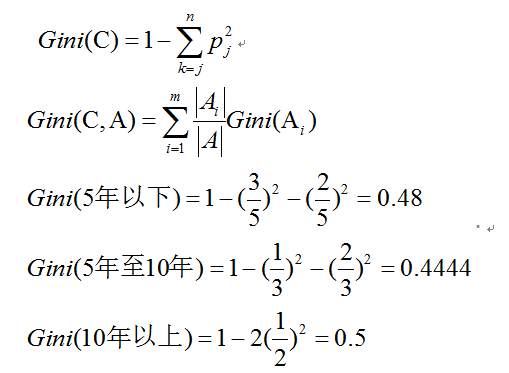 同理,可以计算得到教育程度与经验这两个属性的Gini系数为Gini(教育程度,C)=0.396/0.881 = 0.286