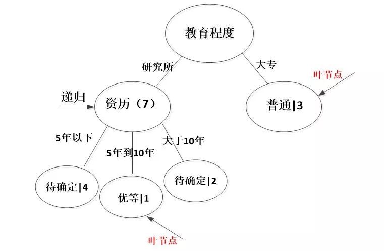 根据选择信息熵大的作为分支节点,那么就选择资历作为下一个分支节点。对于大专这个分支,已经不用分支了,已经分类唯一,就是叶节点。 职员 资历 教育程度 有无经验 表现