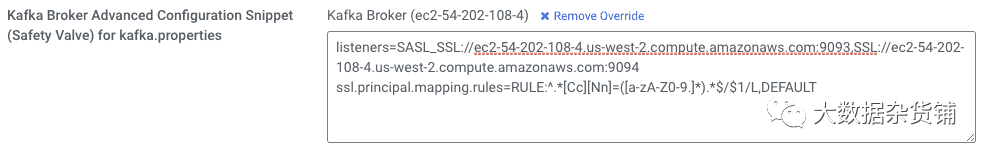为Kafka代理设置以下属性(使用您自己的代理的标准主机名)并保存配置。我们在此安全阀中同时设置了两个不同的属性:listeners和ssl.principal.mapping.rules 。请在listeners属性中注意每个侦听器的不同协议和端口。