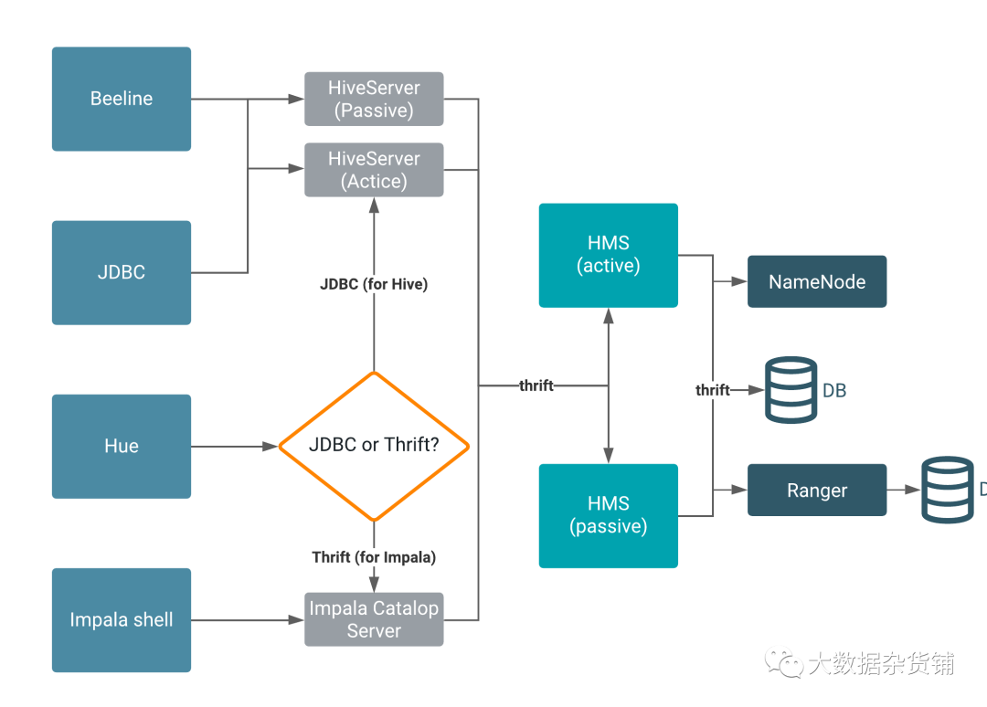 Hive Metastore(HMS)是一项单独的服务,不是Hive的一部分,甚至不必位于同一集群上。HMS将元数据存储在Hive、Impala、Spark和其他组件的后端。Beeline、Hue、JDBC和Impala Shell客户端通过thrift或JDBC向HiveServer发出请求。冗余的HiveServer是被动的,可提供故障转移服务。HiveServer实例将数据读取/写入HMS。后端的一个或多个HMS实例可以与其他服务(例如Ranger)对话。冗余HMS是被动的,可提供故障转移服务。物理数据驻留在后端RDBMS中,一个用于HMS,一个用于安全服务,例如Ranger。在任何给定时间,所有连接都会路由到单个RDBMS服务。HMS通过thrift与NameNode进行对话,并充当HDFS的客户端。