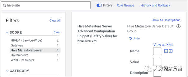 要集成HMS API和Ranger以授权查询,您需要使用Cloudera Manager将以下HMS属性和值添加到hive-site.xml中:hive.metastore.pre.event.listeners的值为:org.apache.hadoop.hive.ql.security.authorization.plugin.metastore.HiveMetaStoreAuthorizerhive.security.authenticator.manager的值为:org.apache.hadoop.hive.ql.security.SessionStateUserAuthenticator使用Cloudera Manager安全阀将属性添加到hive-site.xml。1) 在Cloudera Manager中,要配置Hive Metastore属性,请单击集群> Hive-1 >配置。在hive-site.xml的Hive Metastore Server高级配置代码段(安全阀)中,单击+。
