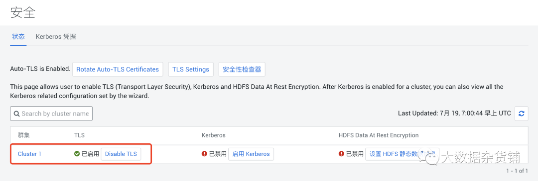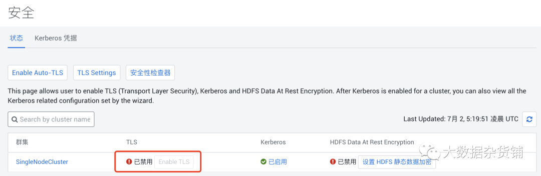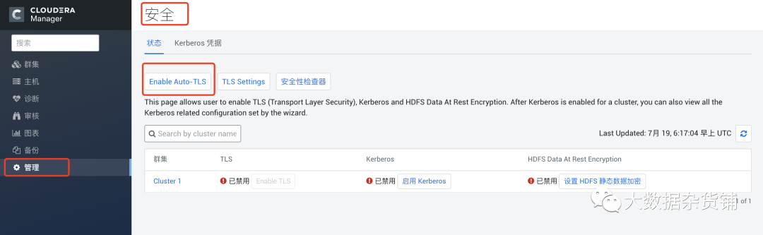 级别1(好) - 此级别仅配置浏览器和ClouderaManager之间以及代理和ClouderaManager服务器之间的加密通信。请参阅仅为Cloudera Manager配置TLS加密,然后按照级别1:为Cloudera Manager代理配置TLS加密,以获取说明。 1级加密可以防止对代理和Cloudera Manager之间的通信进行窥探。