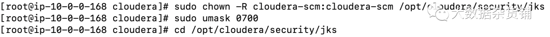 sudo chown -R cloudera-scm:cloudera-scm /opt/cloudera/security/jkssudo umask 0700cd /opt/cloudera/security/jks