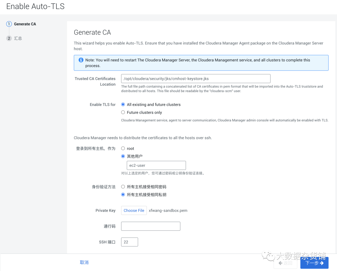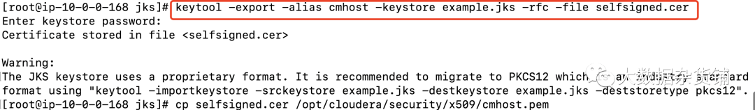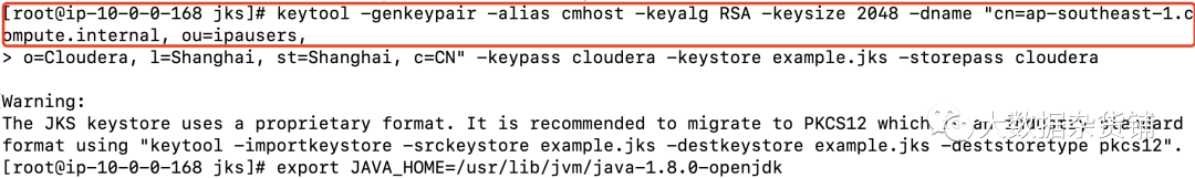 [root@ip-10-0-0-168 jks]# keytool -genkeypair -alias cmhost -keyalg RSA -keysize 2048 -dname "cn=ap-southeast-1.compute.internal, ou=ipausers,> o=Cloudera, l=Shanghai, st=Shanghai, c=CN" -keypass cloudera -keystore example.jks -storepass clouderaWarning:The JKS keystore uses a proprietary format. It is recommended to migrate to PKCS12 which is an industry standard format using "keytool -importkeystore -srckeystore example.jks -destkeystore example.jks -deststoretype pkcs12".[root@ip-10-0-0-168 jks]#