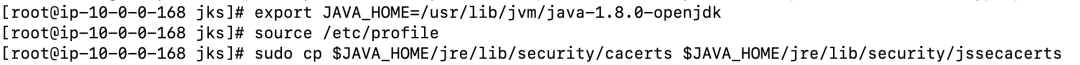 export JAVA_HOME=/usr/lib/jvm/java-1.8.0-openjdksource /etc/profilesudo cp $JAVA_HOME/jre/lib/security/cacerts $JAVA_HOME/jre/lib/security/jssecacerts