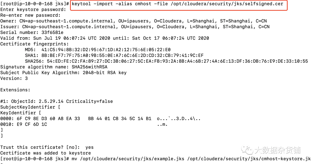 $ keytool -import -alias cmhost -file /opt/cloudera/security/jks/selfsigned.cer-keystore $JAVA_HOME/jre/lib/security/jssecacerts -storepass changeit[root@ip-10-0-0-168 jks]# keytool -import -alias cmhost -file /opt/cloudera/security/jks/selfsigned.cerEnter keystore password:Re-enter new password:Owner: CN=ap-southeast-1.compute.internal, OU=ipausers, O=Cloudera, L=Shanghai, ST=Shanghai, C=CNIssuer: CN=ap-southeast-1.compute.internal, OU=ipausers, O=Cloudera, L=Shanghai, ST=Shanghai, C=CNSerial number: 33f6581eValid from: Sun Jul 19 06:07:24 UTC 2020 until: Sat Oct 17 06:07:24 UTC 2020Certificate fingerprints:MD5: 41:C5:94:8B:32:D2:95:67:1D:A2:12:75:6E:05:22:E0SHA1: 8B:BE:F7:7F:75:A0:9B:55:0E:A7:6C:6E:2D:CD:32:CB:79:41:9C:EFSHA256: 54:ED:FE:C2:FA:89:27:DC:3B:06:27:5C:EA:FB:93:2A:8B:A4:6B:27:4A:6E:13:DF:36:DB:76:E9:DE:33:10:55Signature algorithm name: SHA256withRSASubject Public Key Algorithm: 2048-bit RSA keyVersion: 3Extensions:#1: ObjectId: 2.5.29.14 Criticality=falseSubjectKeyIdentifier [KeyIdentifier [0000: 6F C9 8E D3 60 A8 EA 33 BB 44 01 C8 34 5C 14 B1 o...`..3.D..4..0010: E9 CF 6D 1C ..m.]]Trust this certificate? [no]: yesCertificate was added to keystore[root@ip-10-0-0-168 jks]#