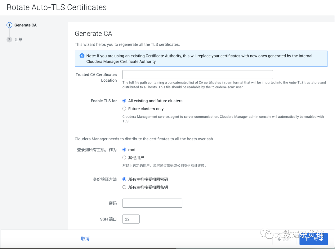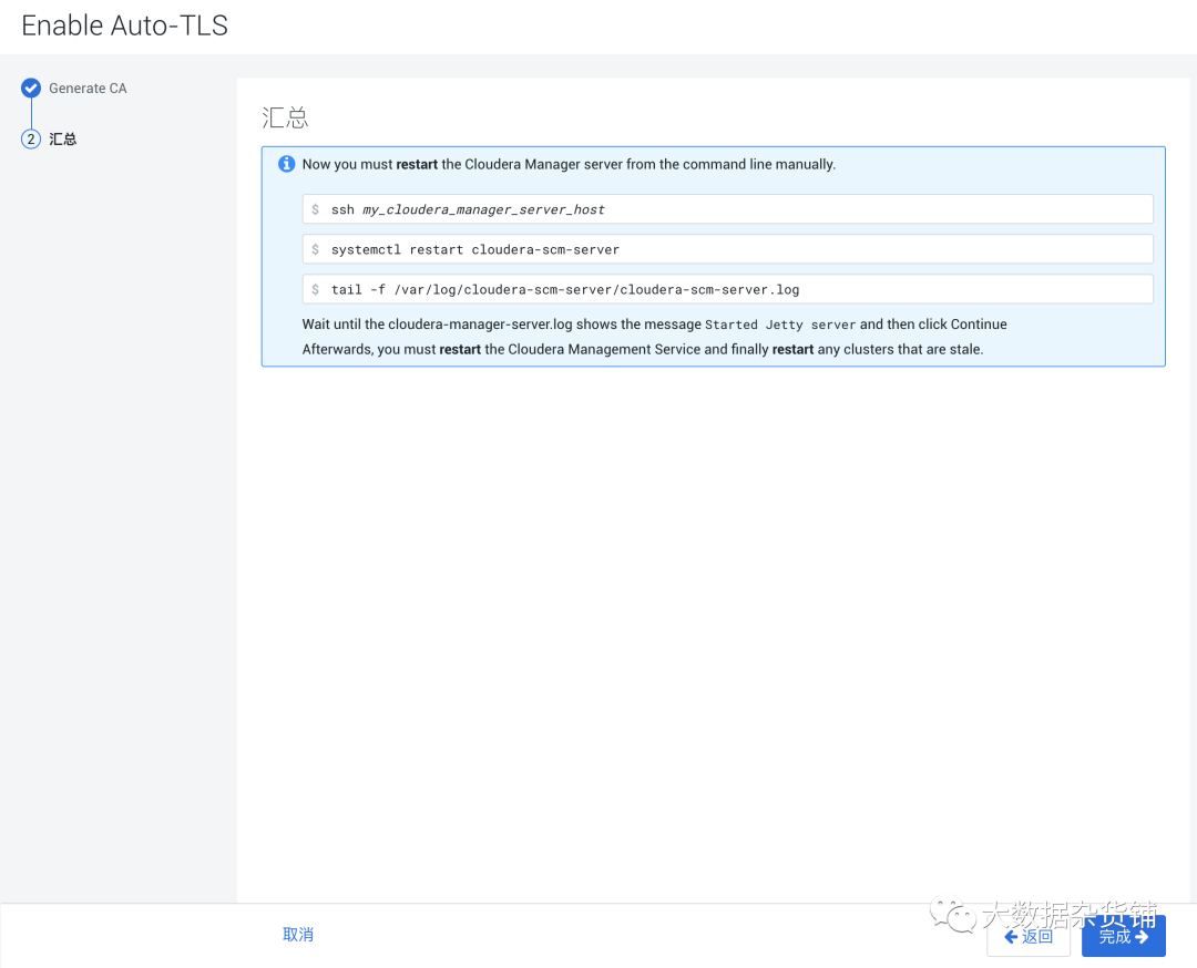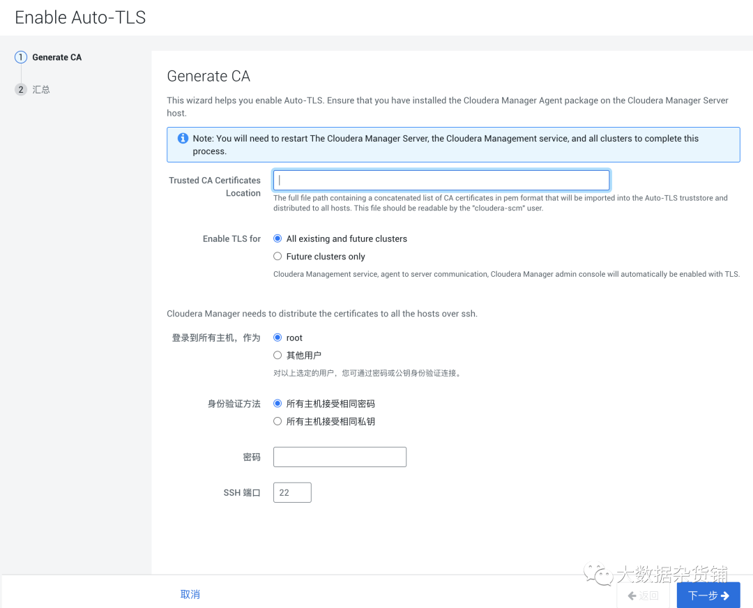 级别2(更好) - 此级别包括代理和服务器之间的加密通信,以及代理对Cloudera Manager服务器证书的强大验证。请参阅第2级:由代理配置ClouderaManager服务器的TLS验证。级别2通过验证由Cloudera Manager服务器提供的证书的信任,为代理提供额外的安全级别。