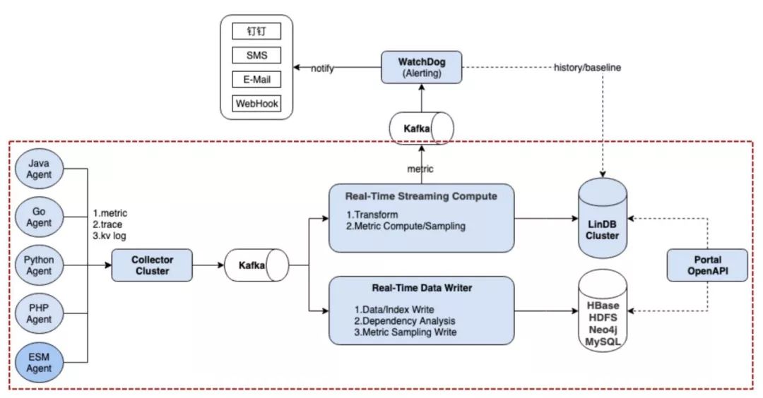 最后将 10s 预聚合的数据写入到 LinDB 时序数据库(已开源,有兴趣的可以关注 star 下)中,以及 Kafka 中,让告警模块 watchdog 去消费 Kafka 做实时告警。