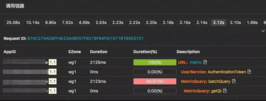 上图是某个10s 时刻、某个 type 和 name 过滤条件下的采样链路。 第一行是这 10s 内的采样链路,按照响应时间进行了排序。 可以随意点击某个响应时间来查看对应的链路详情。