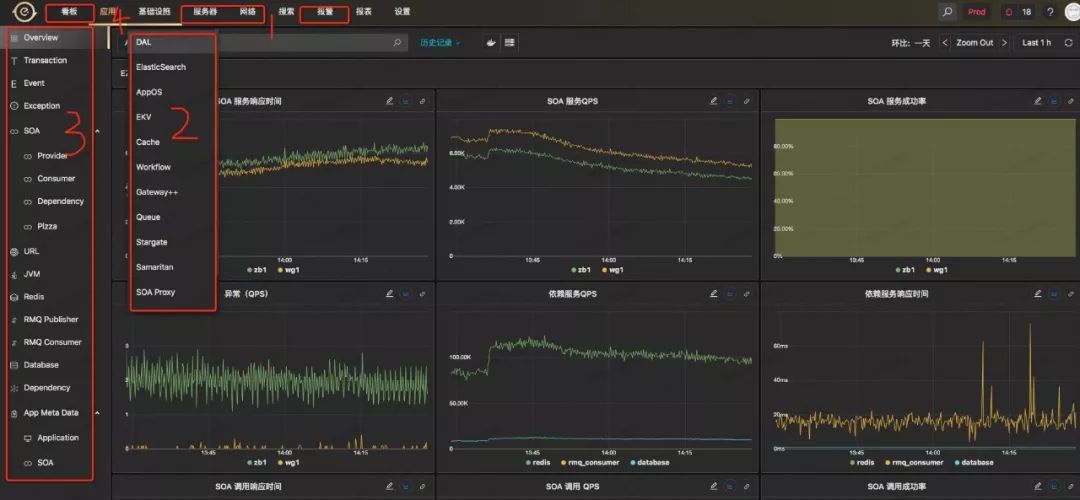应用大盘:就是为当前应用构建上下游应用依赖的监控、当前应用所关联的机器监控、Redis、MQ、Database 等等监控,可以时刻为应用做体检,来主动暴露出问题,而不是等用户去一个个查指标而后发现问题。
